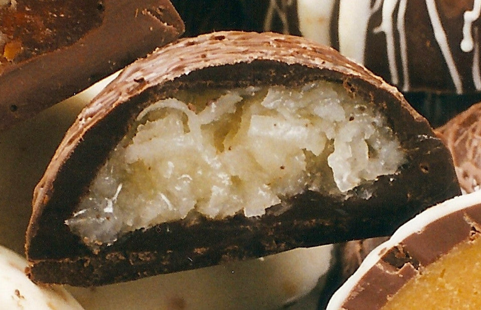 One of my biggest sellers, and one taste will tell you why! A dark chocolate shell is jam-packed with coconut in a homemade, sticky, sweet creme. Incredible, with just the right bit of this and hint of that to make you forget all your troubles.